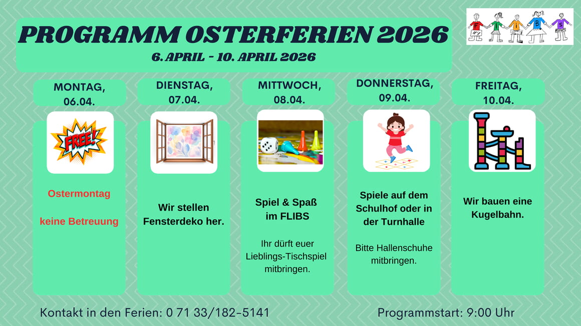 Die Anmeldung für die Ferien wird ca. vier Wochen vor den jeweiligen Ferien auf dieser Seite hochgeladen. Parallel werden die Anmeldungen in Papierform ausgegeben. (Wenn bei der Anmeldung zu Beginn des Schuljahres das Interesse an der Ferienbetreuung angegeben wurde.) Diese bitte per Mail oder in Papierform (über die Klassenlehrerin, Briefkasten der Schule) bis zum angegebenen Stichtag dem FLIBS zukommen lassen.