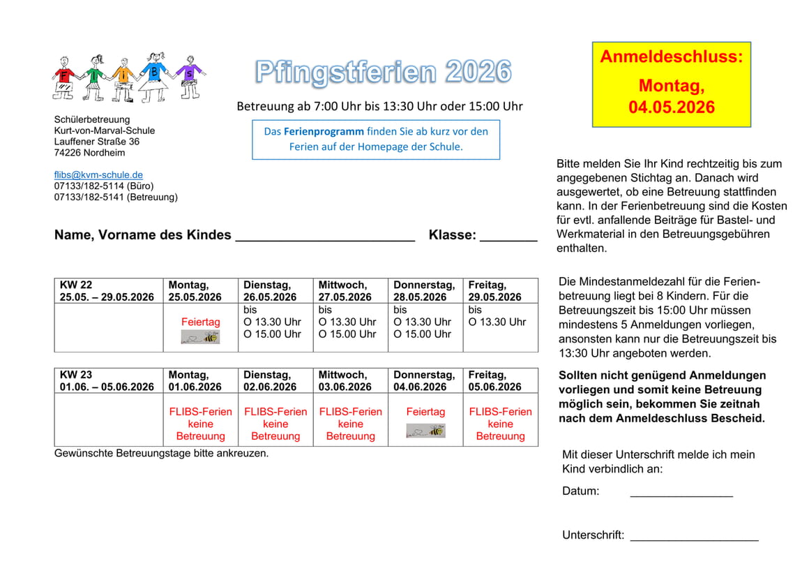 Zusätzlich zur Anmeldung in der Ganztages- und Kernzeitbetreuung gibt es für alle Kinder (von Klasse 1-4) aus Nordheim und Nordhausen die Möglichkeit, in (fast) allen Ferien ins FLIBS zu kommen. Das Interesse an Ferienbetreuung muss bei der FLIBS-Anmeldung angegeben werden. Die Betreuung kann auch nur für die Ferienzeit und ganz nach individuellen Bedarf in den jeweiligen Ferien gebucht werden.